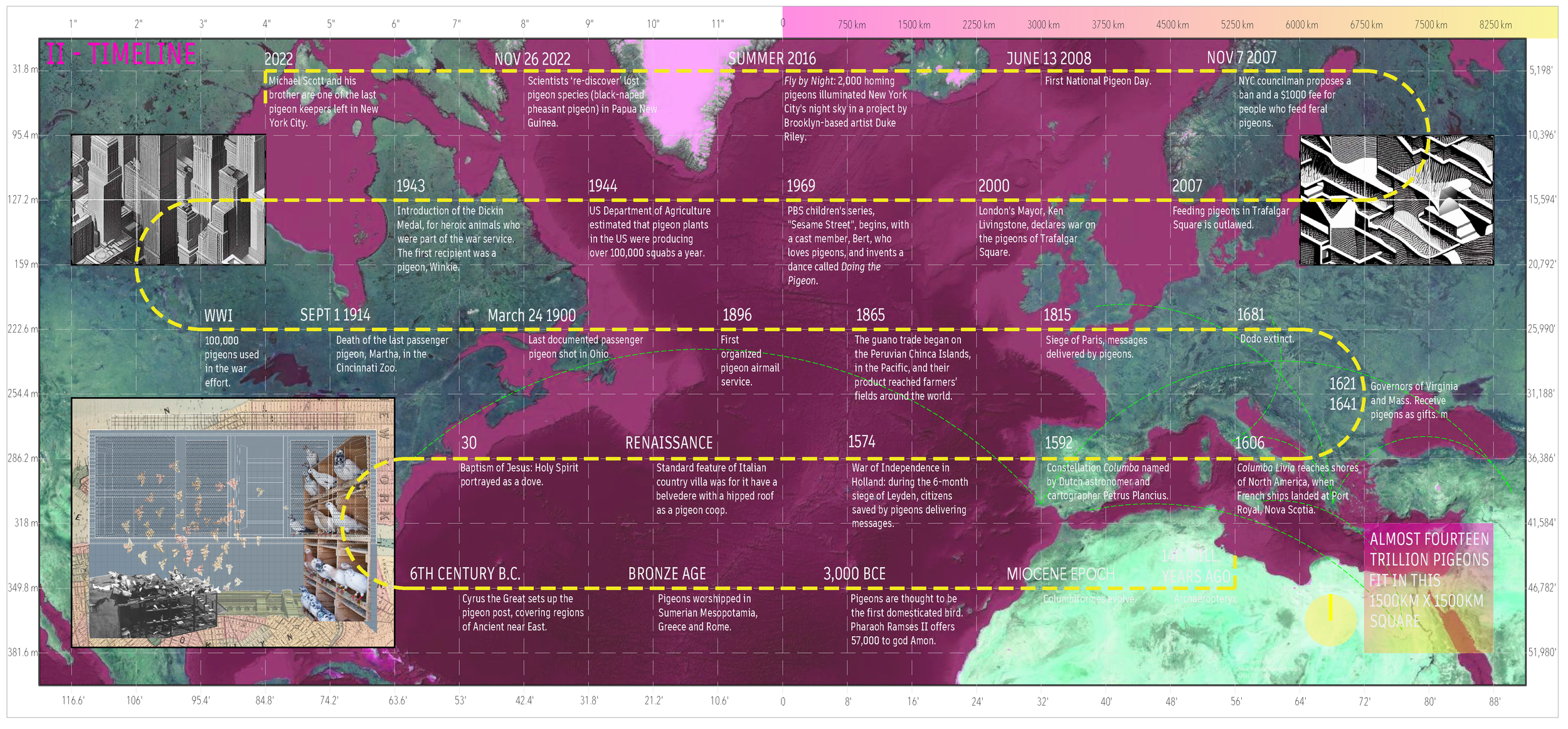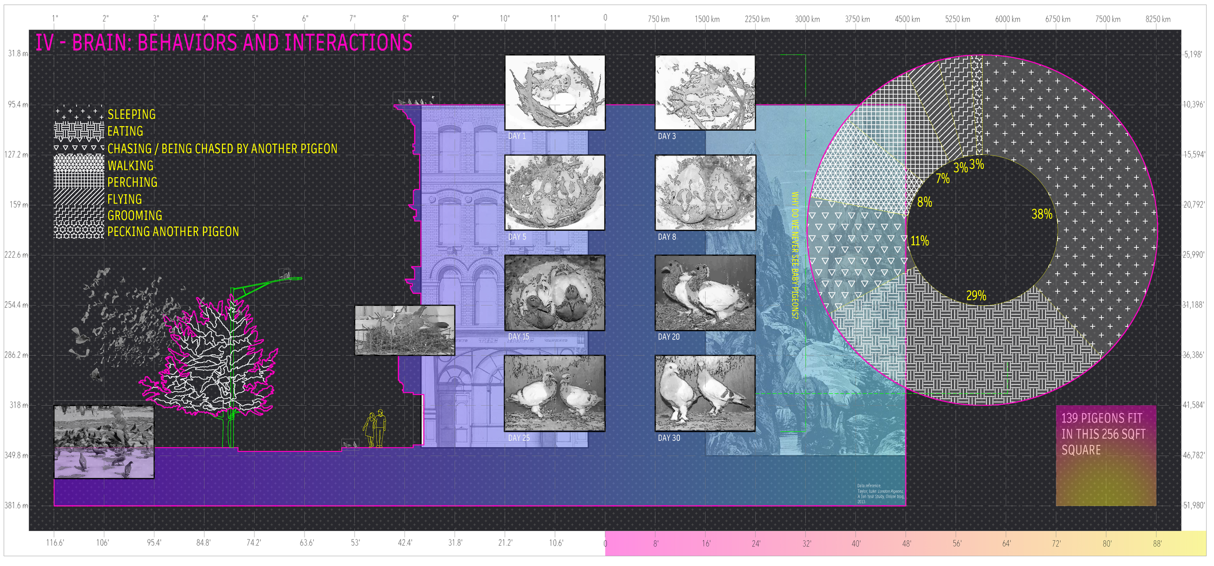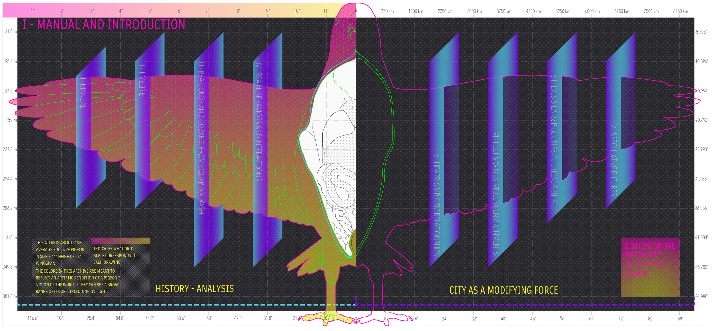 Status symbol, religious offering, metaphor, gift, messenger, spy, target, fertilizer, ammunition, food, pet, pest. The pigeon, while inevitably affected by the decisive opinions that surround its very existence, has historically managed time and time again to thrive indifferently from what people’s purposes for them have been, resulting in an established (albeit heavily contested) place in the ecosystem of modern cities all around the world. This is part of why their presence makes a lot of people uncomfortable; while animal life started disappearing from cities during the industrial revolution, (with the emergence of two inventions; the diesel engine and the refrigerated van, which allowed us to further distance our daily direct interactions with nature, under the concepts of convenience and hygiene (Belotti. p. 8) the pigeon was never gone or entirely replaced. While horse droppings steadily gave way to the smell of diesel and gasoline, pigeon’s acidic guano continued to corrode buildings, monuments, and the precious topcoat of enamel paint of the lucky New Yorkers who happened to own a car. Ultimately, the drawings and maps in this Atlas aim to analyze this psycho-spatial relationship through the lens of the pigeon’s own anatomy: How can the specific framing of different parts of its physiognomy help us unveil the cultural ecology and complex network of history and stories that make the rock dove such a valuable indicator of the city’s evolution.