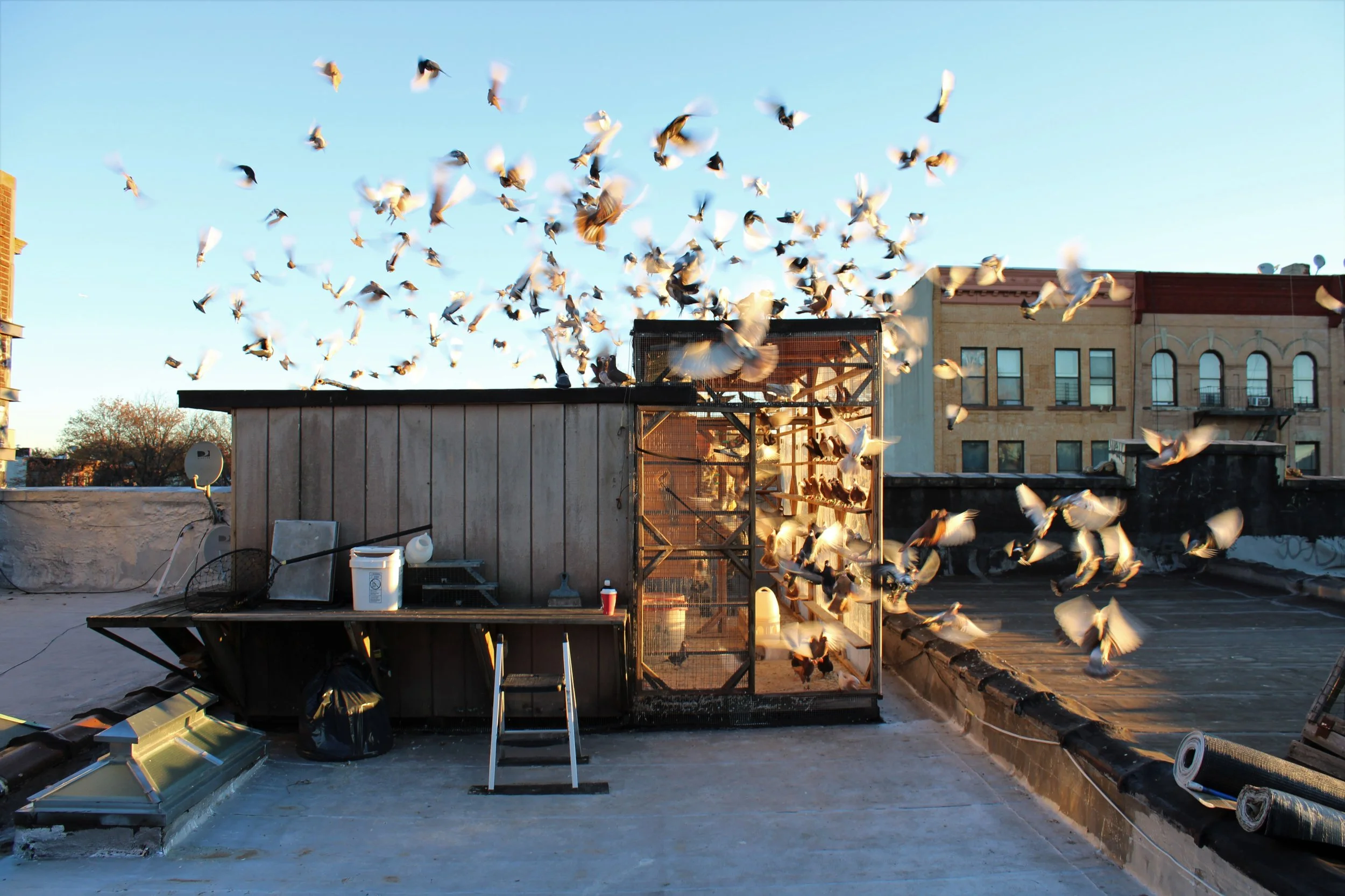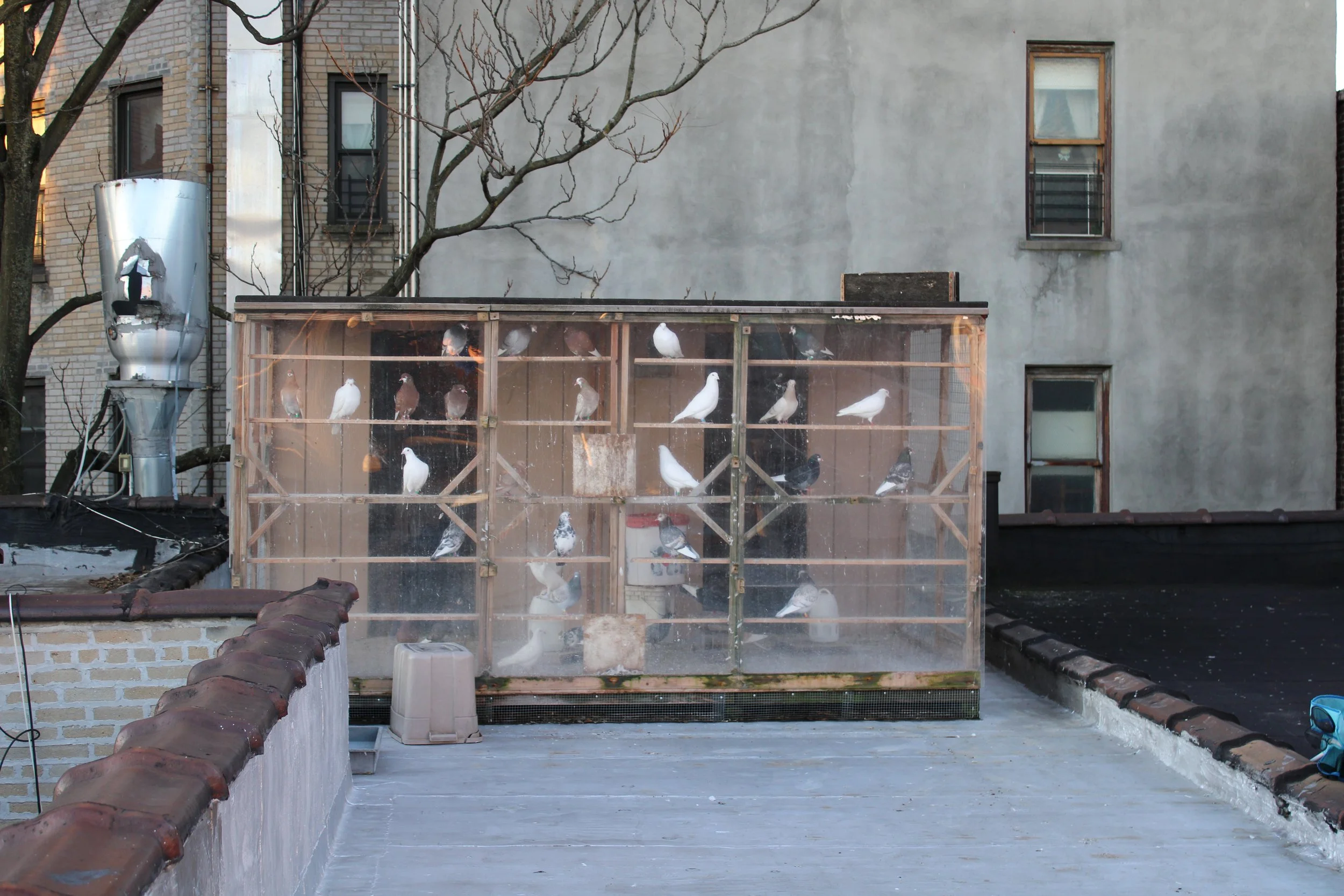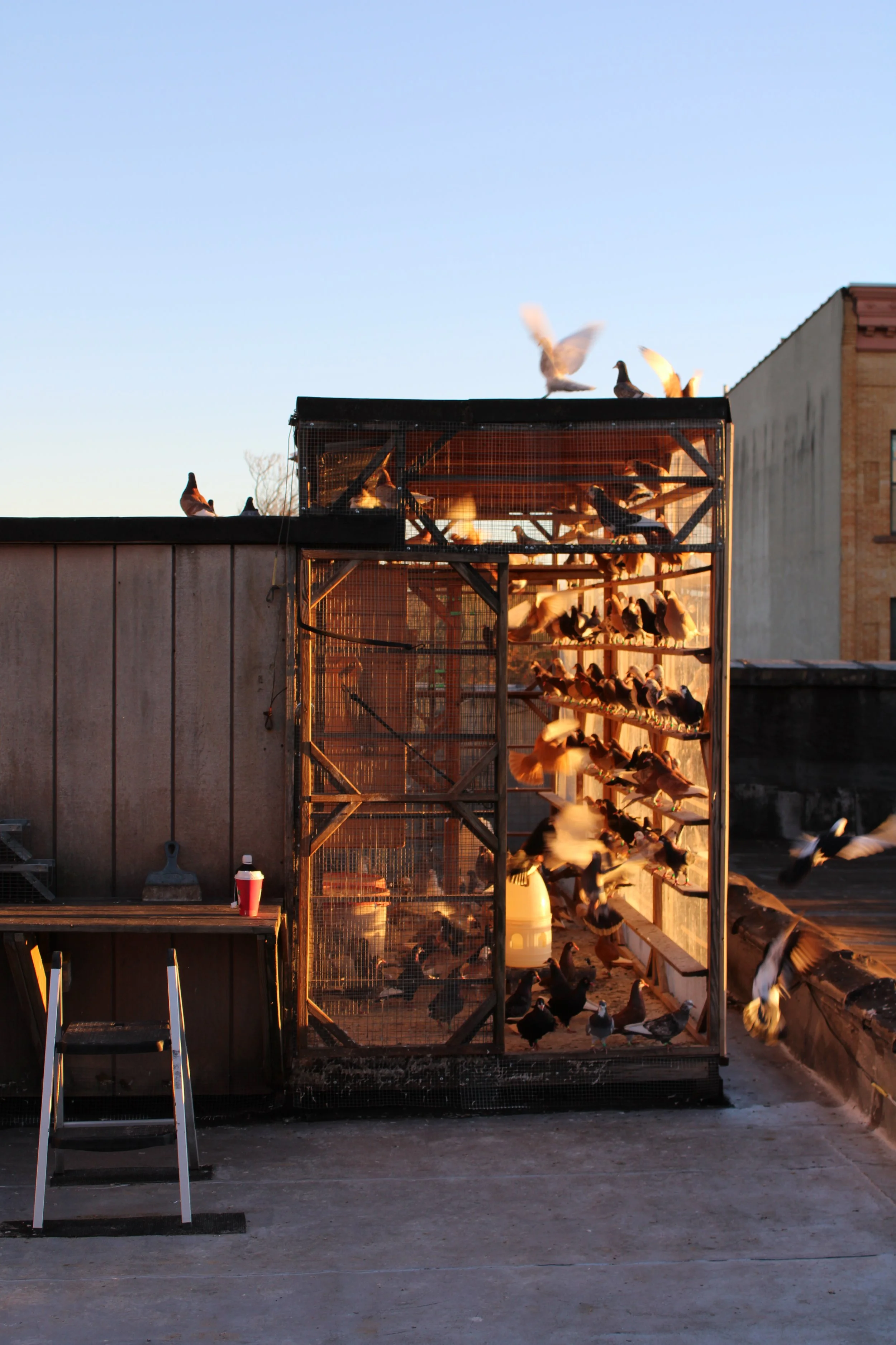 To contrast this broad analysis, a series of textual interjections in the form of interviews and photographs excavates a specific symbiotic relationship that, although dwindling, has stood the test of time for many generations and even bridged social and racial divisions. Pigeon keeping (also called breeders, flyers, even mumblers), is a time-honored practice that had its zeitgeist in the 50’s, when thousands of rooftop “lofts” or coops were scattered all over lower Manhattan, The Bronx, Queens and Brooklyn. Urban sociologist and researcher Colin Jerolmack explains how the craft is disappearing, a consequence of a combination of economic, bureaucratic, and generational shifts, but that this recipe is precisely what makes it so special nowadays: