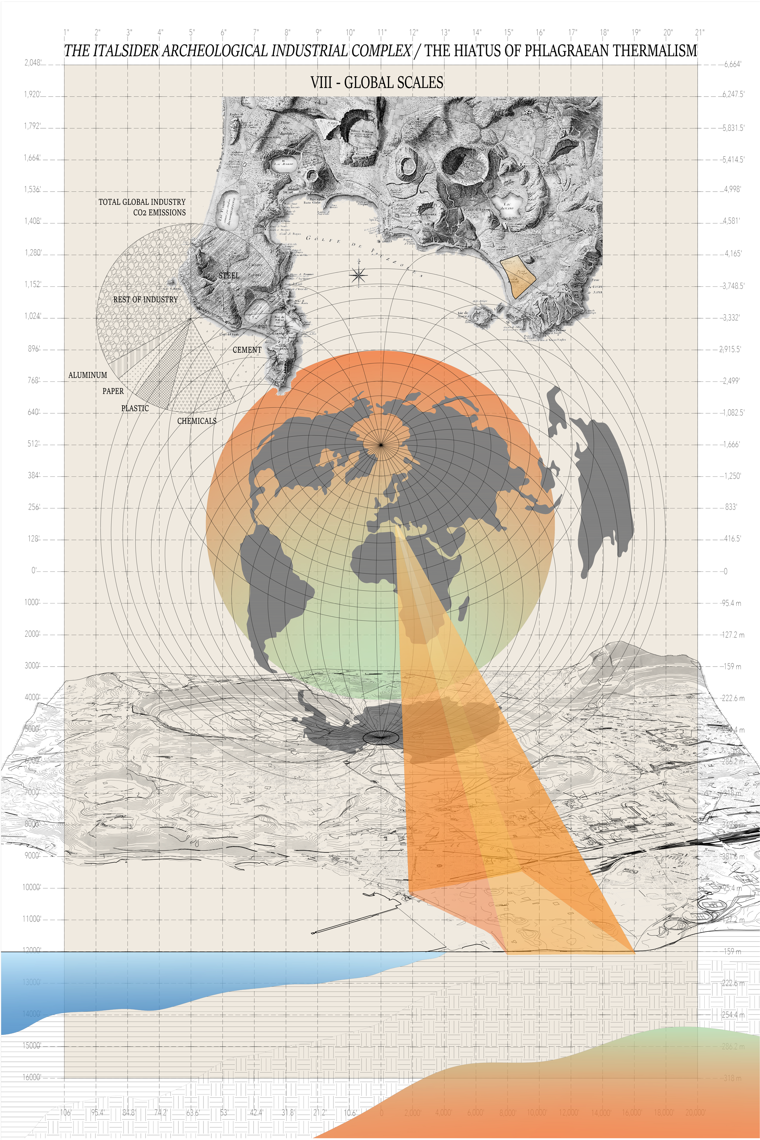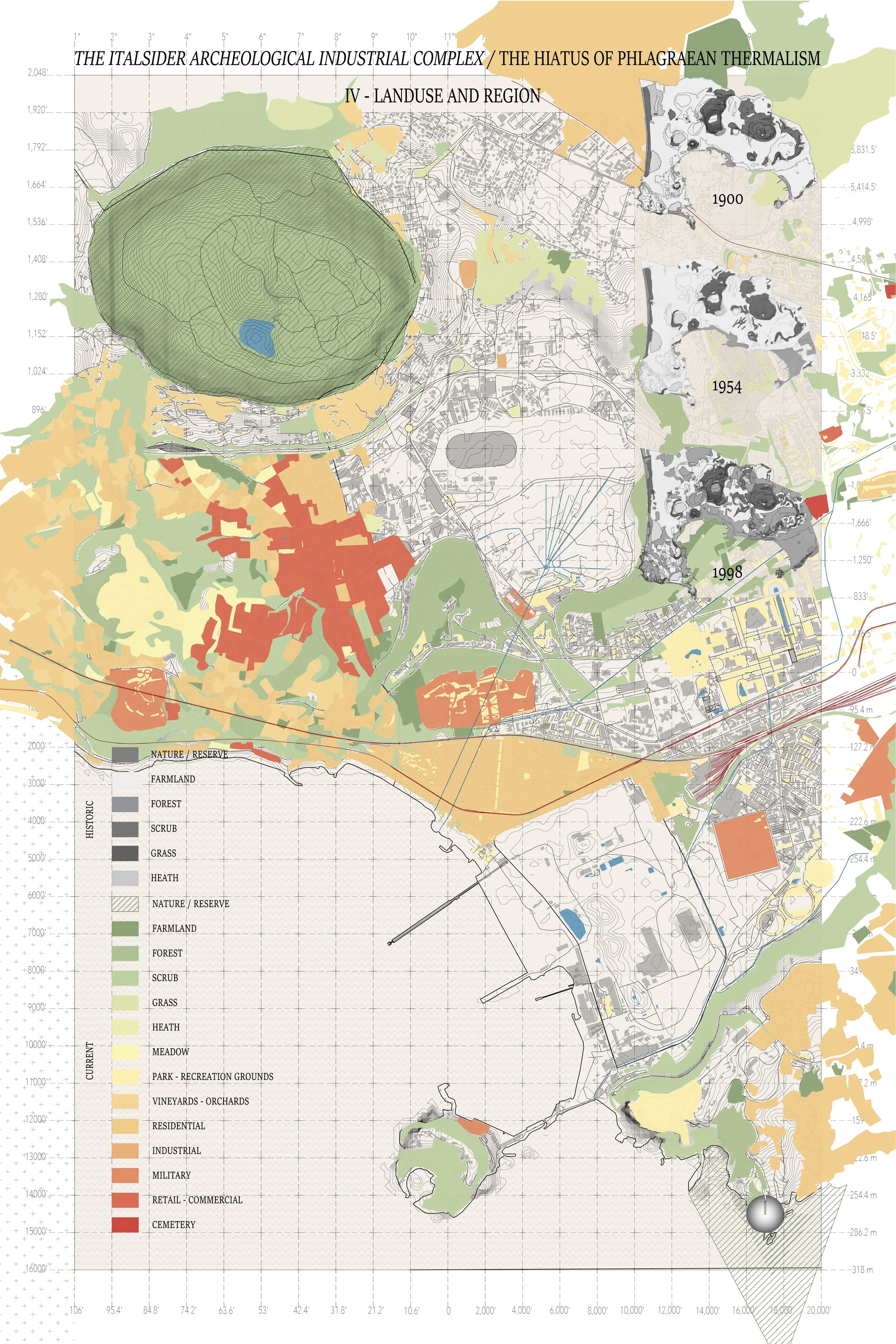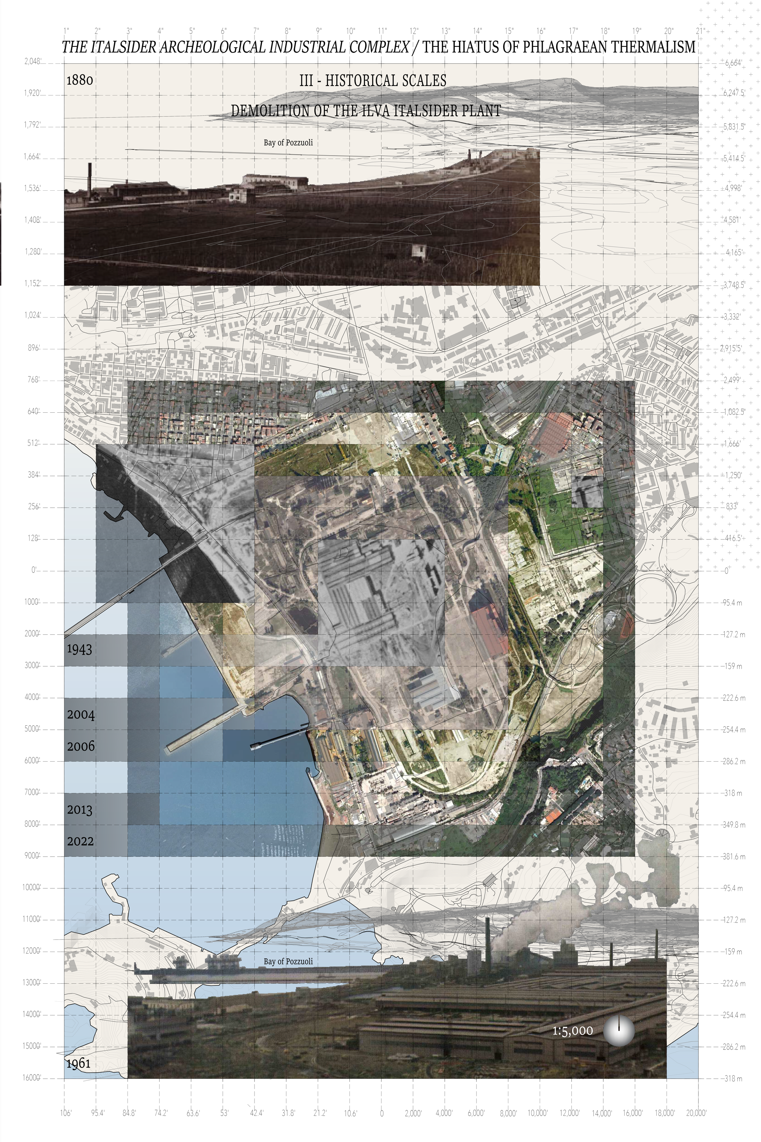 Added to these phenomena; the hazard map of Napoli identifies the industrial site as an H2 risk classification; which means it is within the line of danger for pyroclastic fall products sourcing from Campi Flegrei. Liminal to the site, and the ultimate recipient of industrial and geochemical waste, is the water. The coastline and the bay become the unlikely supporting characters of a site caught in between industrial and volcanic systems, weaving the utopian ideal of Balneoli into a complex landscape. Throughout the following pages the history -past, present, and future- of the Italsider industrial complex is questioned and further complicated.